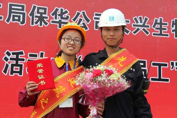 5月3日,在中建保华公司大兴生物医药基地项目“创先争优”活动之“先锋员工”、“建筑之花”表彰会上,作为“巾帼标兵队”一员的小陈和老公双双获奖,让现场所有人竖起了大拇指。和另外31名获奖人员一样,他们都是由项目上的农民工们自己推选出来的,一个工友高兴地说:“这是我们自己选出的‘工地劳模’。”