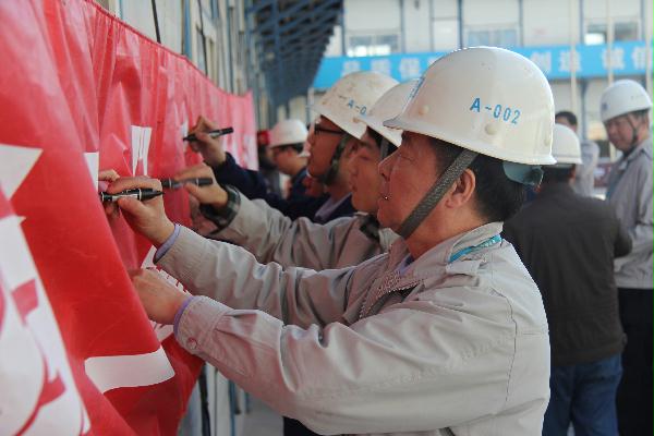 3月4日,局第三届“质量安全集中活动日”活动正式启动。局属500多个在施项目积极响应,纷纷开展一系列活动,在全局营造出“关注质量、关注安全”的良好氛围。图为一公司大兴项目员工在安全条幅上签字。(王任川 张彬/摄)