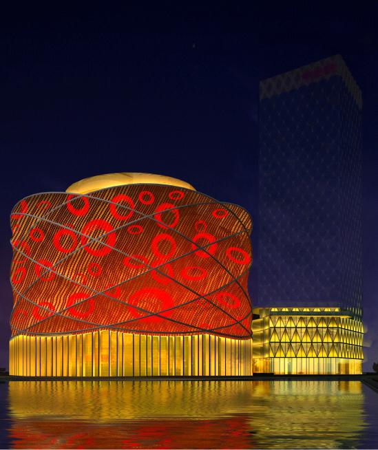 “汉秀”剧场建筑灵感源自中国红灯笼,由世界顶尖建筑艺术大师,北京奥运会、广州亚运会、伦敦奥运会开闭幕式艺术总监马克·菲舍尔亲自设计。轻盈剔透的灯笼结构美轮美奂,通过三层挑高的大堂可以向上一览无限星空,传统元素与现代技术的高度融合,成为武汉秀场造型设计上的最大特色。设计上美轮美奂的“大红灯笼”对施工方来说充满了挑战,而第一个挑战就从“灯笼底座”开始。