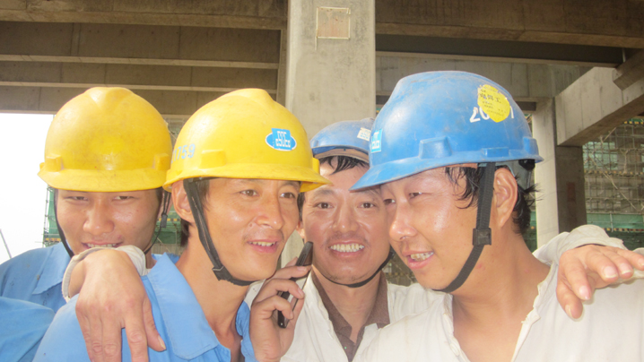 中建电力阳江核电常规岛项目施工人员利用手机的收音机功能聆听总书记讲话