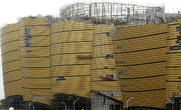 近日,在湖北省武汉市武昌楚河汉街太极广场附近,由我局承建的武汉万达电影文化公园主体工程已经完成,建筑外立面贴满了“土豪金条”。工人正在紧张施工中,整个建筑放眼望去,就像是很多“金条”装饰出的一个巨型“黄金屋”。(冷利云)