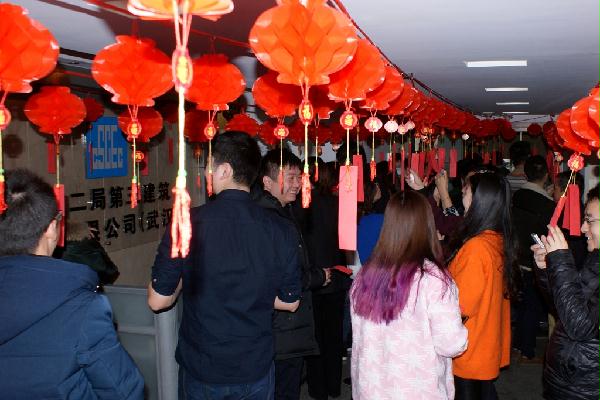 在三公司武汉分公司,“元宵灯谜会”节日活动正在上演。活动现场,一条条彩纸制成的谜语悬挂在一排排红灯笼穗下,谜面有物谜、事谜、人谜、字谜等类,既具娱乐性,又具知识性。活动现场,员工们争先恐后地猜着谜语,大家脸上都洋溢着欢乐、喜悦的笑容,活动现场热闹非凡。