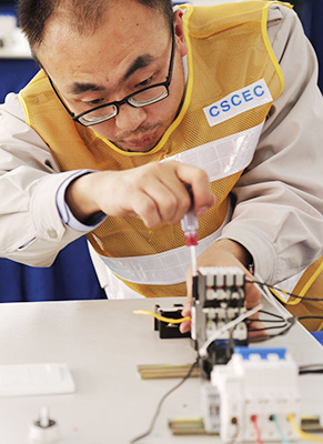 本次大赛面向在北京市施工的建筑从业人员,分砌筑工、钢筋工、测量放线工、工程电气设备安装调试工和管工五个工种进行比赛。在全市统一进行的笔试答题之后,工程电气设备安装调试工竞赛于11日在中建二局项目进行了实际操作比拼环节。中建二局共派出34名选手参加了各个工种的比赛,其中工程电气设备安装调试工测试共派出10名选手。