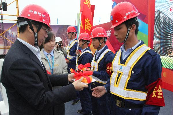 安全书籍、安全小药箱、慰问品……4月19日,在一公司义乌万达项目举行的2014年“效益杯”劳动竞赛、“安康杯”竞赛暨创建工人先锋号启动仪式上,一公司负责人向10名义乌万达项目农民工代表赠送了“安全套餐”,为农民工安全生产保驾护航。浙江省建设工会副主席方冬子,局党委副书记、纪委书记、 工会主席邓小林,业主、监理单位领导出席了启动仪式,共计近200人参加了活动。