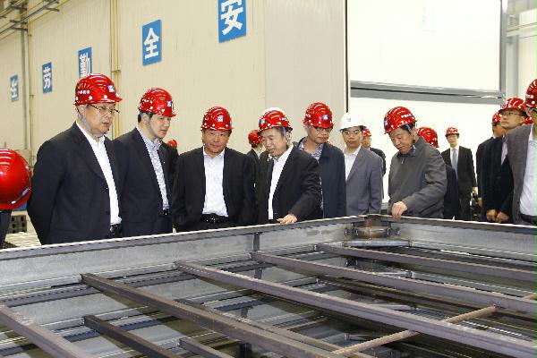 刘锦章一行首先参观了廊坊建机公司生产制作的中建临建标准化第一代箱式房样品和生产流水线,而后听取了廊坊建机公司、中建国际设计院、四局科研院等单位负责人就中建箱式房、围挡产品的介绍与汇报,并听取了中建一局、二局、三局、八局就试用期间的反馈情况和中建发展就临建标准化及产业化的设想。