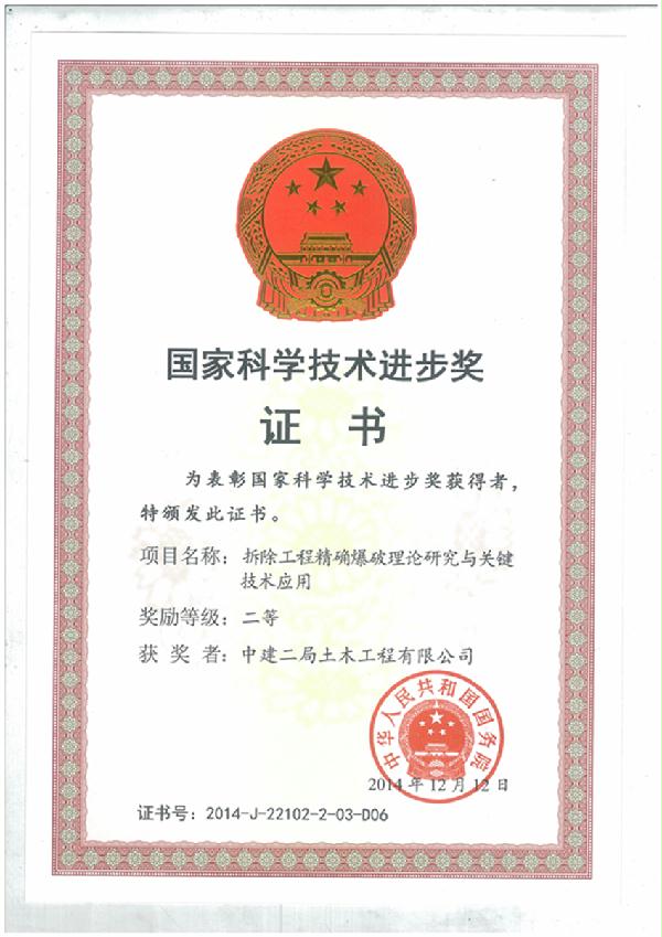 国家科技进步奖 局拆除工程精确爆破理论研究与关键技术应用、大跨空间结构预应力施工技术研究与应用等技术获国家科技进步二等奖。局高层钢结构CAD绘图系统、高强混凝土结构性能等获得“国家科技进步”三等奖。