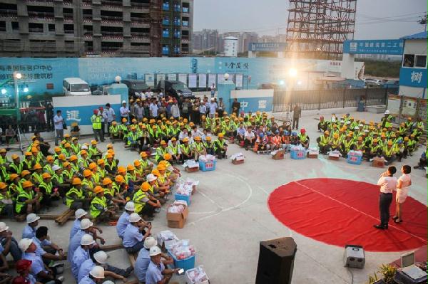 9月12日晚,总公司团委“拓展幸福空间”慰问一线首场演出走进了我局北京分公司亦庄金茂悦项目工地。中建总公司企业文化部副主任、团委书记冯小林,总公司团委常务副书记苗善忠,北京经济技术开发区团工委书记闫英,局党委副书记、纪委书记、工会主席邓小林,局总经理助理、党委工作部部长陈维清来到工地观看演出,并向工友们发放了水杯、水果等慰问品。