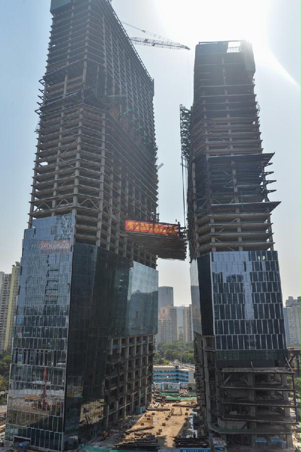 该项目于2011年11月21日成功奠基,总建筑面积约34万平米,包括南、北两座塔楼和低区、中区及高区共三条连接层。此次提升合龙的连廊部分是这座大厦的高区连接层,位于南北塔楼的34 -37层之间,主要功能为阅读、培训、西餐厅等员工公共配套设施。据介绍,此次空中连廊施工的难点在于,连廊重量逾2500吨,需7台YS-PP-60型液压泵源系统同时“发力”。