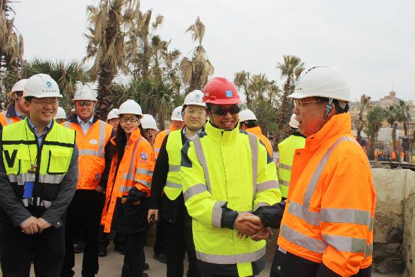中建二局上海分公司总经理翟雷、副总经理苏敬涛等,在工程建设现场向杨雄市长进行了项目情况汇报。杨雄市长与中建二局建设者们在宝藏湾人工湖边合影留念。