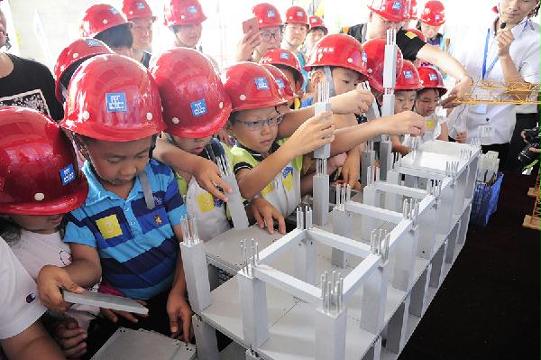 几位抱着孩子的家长停在了“装配式建筑”展区前,看完展品、听完解说后,一位家长说:“这样盖房子简直就像搭积木,太炫酷了!”讲解员笑着说道:“不仅炫酷,更坚固、高效,更重要的是绿色施工,装配式建筑在节能减排方面做得更好,也是我们建筑行业发展的大趋势。”